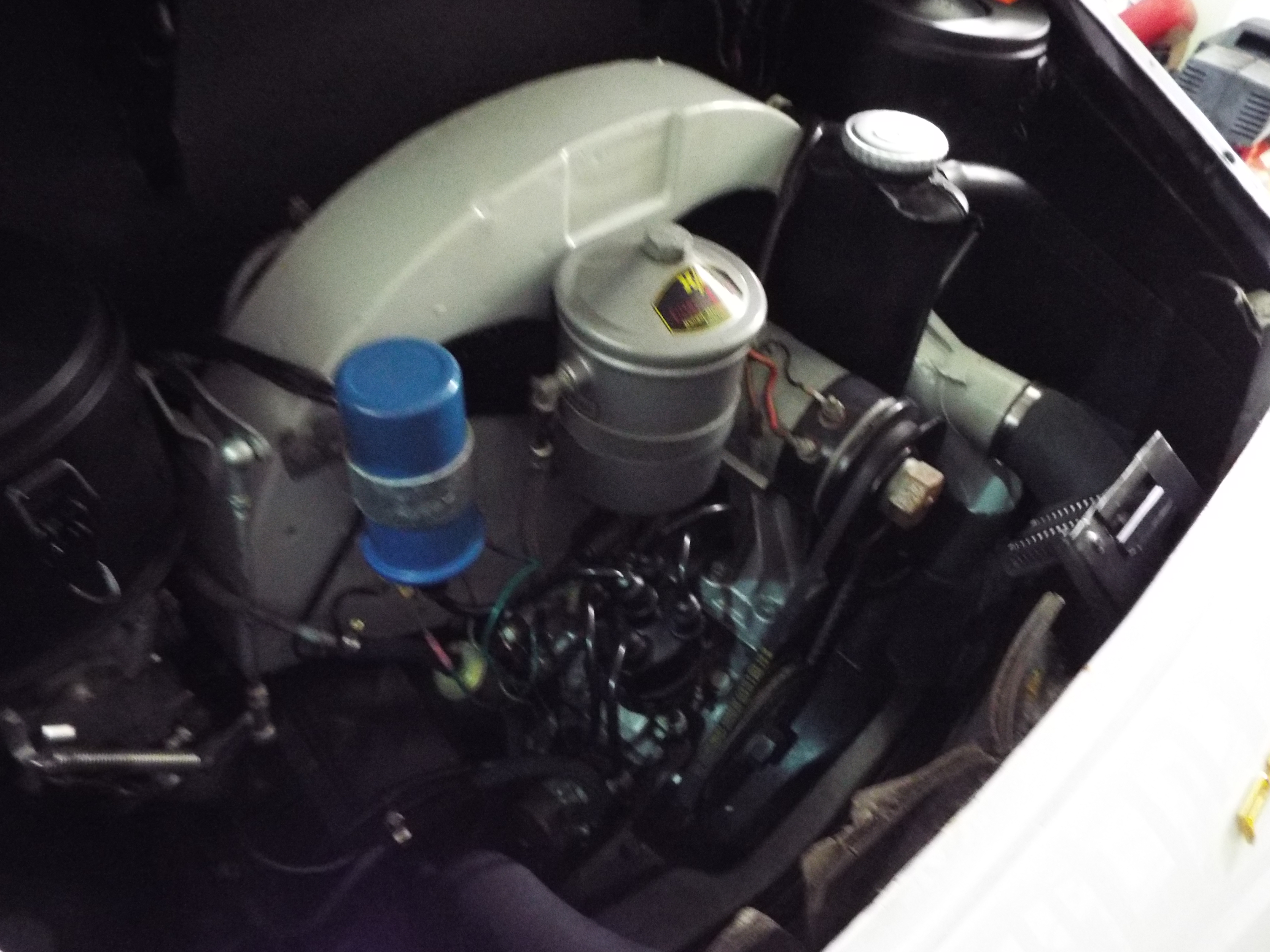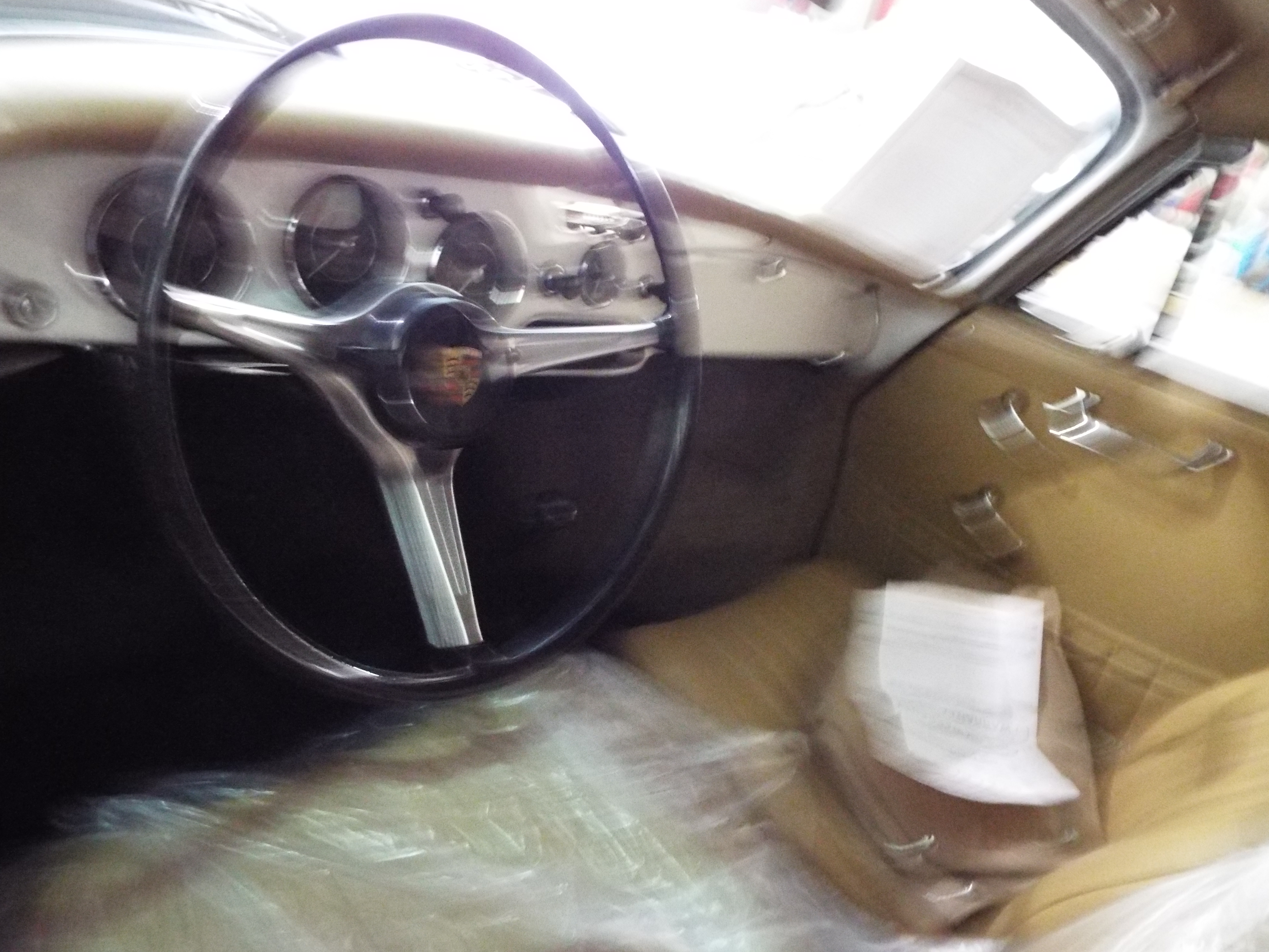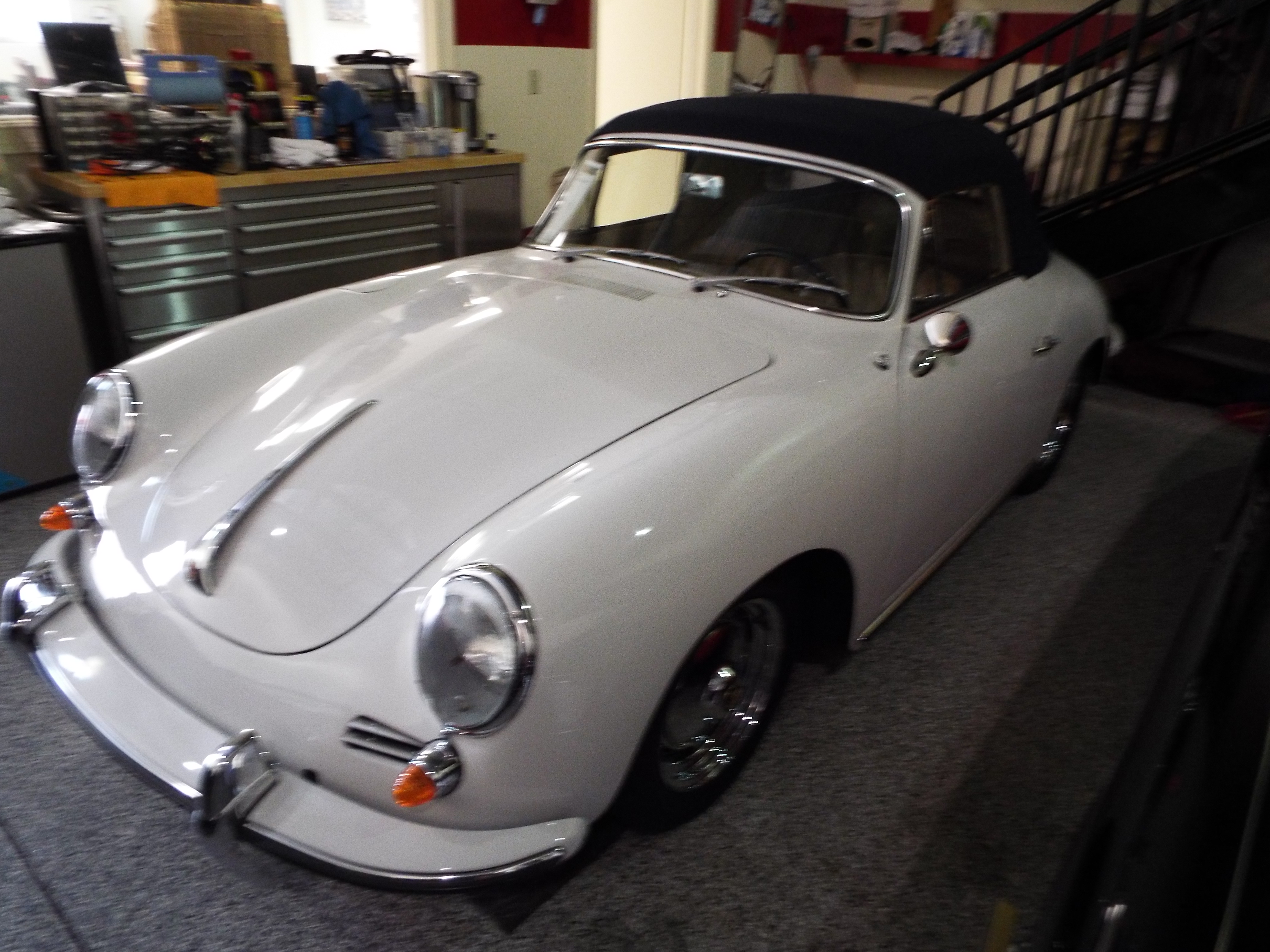 1963 Porsche 356B # 158584 is a later model T6 B model with the square front hood and is the most desirable of the B series cars. It is painted in ivory white over a pristine body. Therea re a number of Euro features on this car,exhausttaillight lenses,valance mounted rear reflectors and front turn signal lenses. The stock looking interior dash,steering wheel and guages are all correct including a radio delete plate. Thu upholstery is covered in soft tan and is accented with german style weave carpeting. A blue canvas top enhances this classic. The engine has been upgraded to a 1600 super,and the engine compartment is stock and detailed. The front trunk compartment is complete with the proper spare along with a tool kit and jack. The wheels are chrome over steel with super 90 hub caps and Pirelli tires.